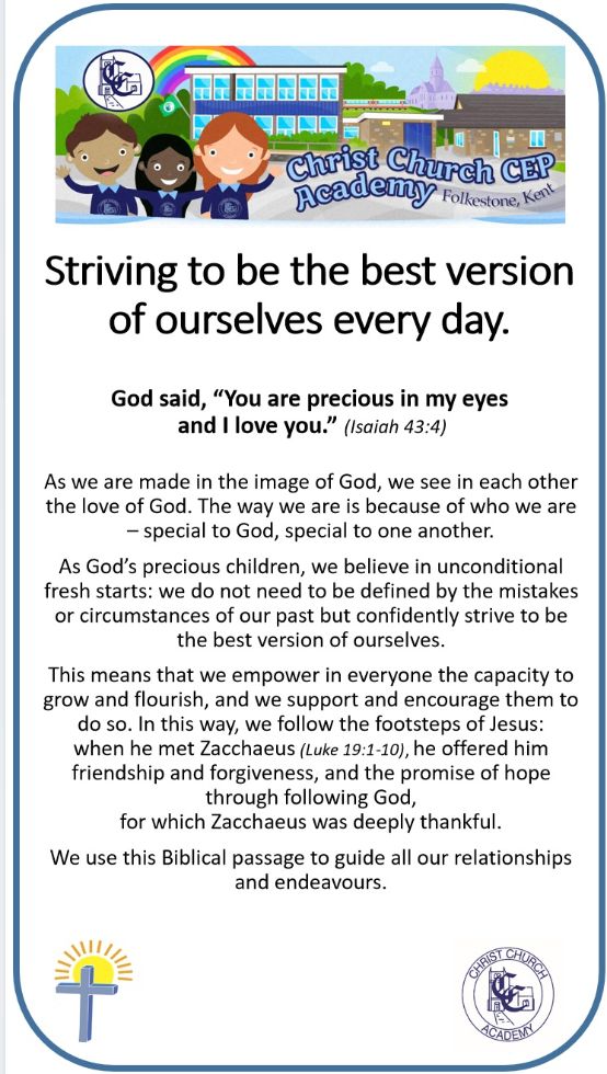 Our school story from Luke 19: 1- 10 Zacchaeus, reminds us daily that as God’s precious children, we believe in unconditional fresh starts: we do not need to be defined by the mistakes or circumstances of our past, but confidently strive to be the best version of ourselves.